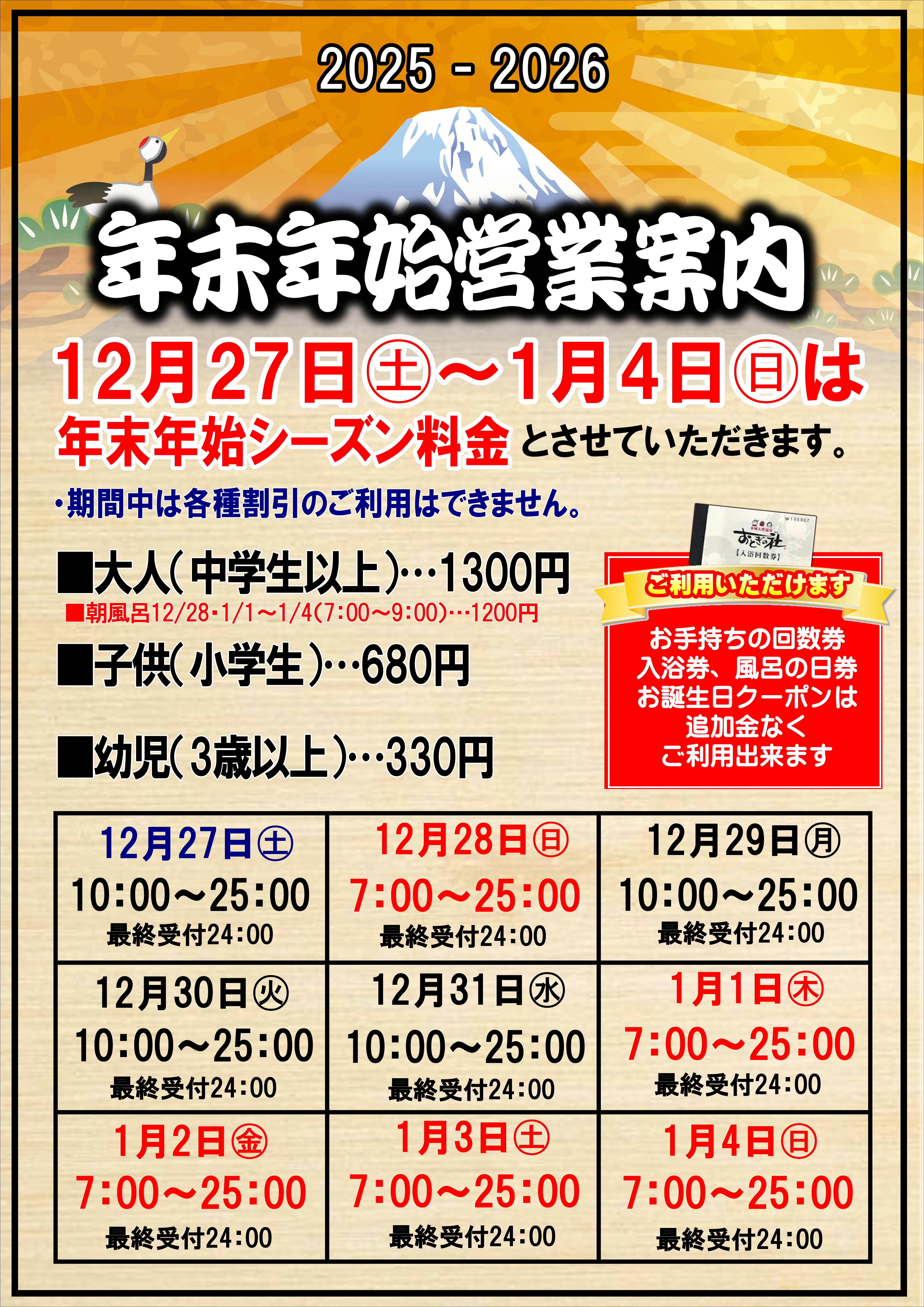 2025.12.21 年末年始の営業案内 お得な情報, 新着情報 年末年始も休まず営業いたします。 12月27日から1月4までの期間はシーズン料金とさせていただきます。 ※お手持ちの回数券、入浴券、26日お風呂の日チケットは 追加金なくそのままご利用いただけます ※期間中は各種割引のご利用はできません。 共有:クリックして Twitter で共有 (新しいウィンドウで開きます)Facebook で共有するにはクリックしてください (新しいウィンドウで開きます)クリックして Google+ で共有 (新しいウィンドウで開きます) 関連