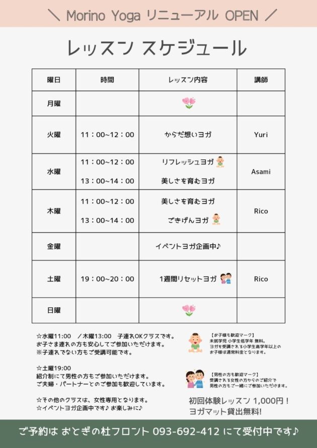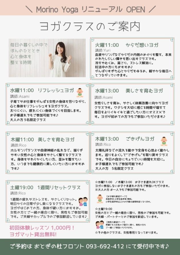 2026.03.05 ヨガリニューアルOPENのお知らせ 新着情報 おとぎの杜のヨガスタジオ『モリノヨガ』のレッスンが 3月11日(水)から リニューアルオープン!! 各レッスンにオリジナルな要素を加えています!! ぜひ一度ご参加ください(*‘∀‘) 共有:クリックして Twitter で共有 (新しいウィンドウで開きます)Facebook で共有するにはクリックしてください (新しいウィンドウで開きます)クリックして Google+ で共有 (新しいウィンドウで開きます) 関連
