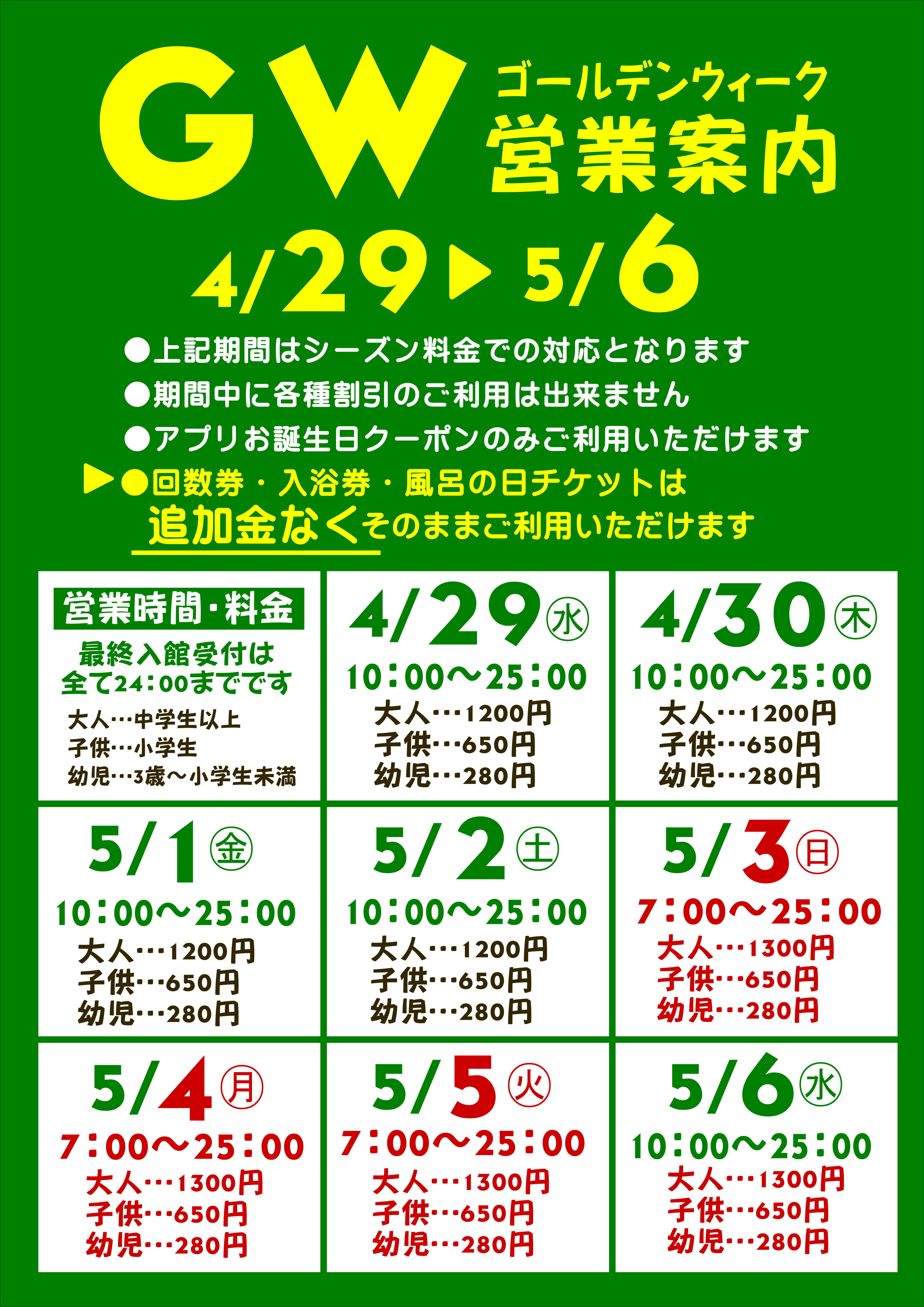 4/29~5/6までの期間はシーズン料金とさせて頂きます。